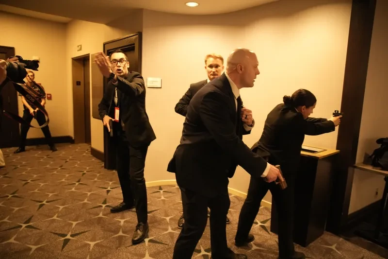 Pripadnici zaštite 79-godišnjeg milijardera i teško naoružano osiguranje skočili su na pozornicu na kojoj je bio glavni stol okružili i izveli predsjednika iz dvorane, zajedno sa suprugom Melanijom i ostalim visokim dužnosnicima: potpredsjednikom J. D. Vanceom, tajnicom za tisak Bijele kuće Karoline Leavitt i nekoliko članova kabineta.
