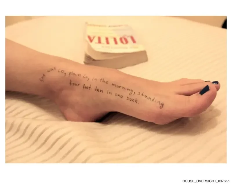 Jedan od citata ispisan na stopalu glasi: “she was Lo, plain Lo, in the morning, standing four feet ten in one sock”, dok se na drugim fotografijama pojavljuju rečenice “she was Lola in slacks” i “she was Polly at school”. U tom kontekstu podsjeća se da je središnja tema romana “Lolita” seksualno zlostavljanje maloljetnice.