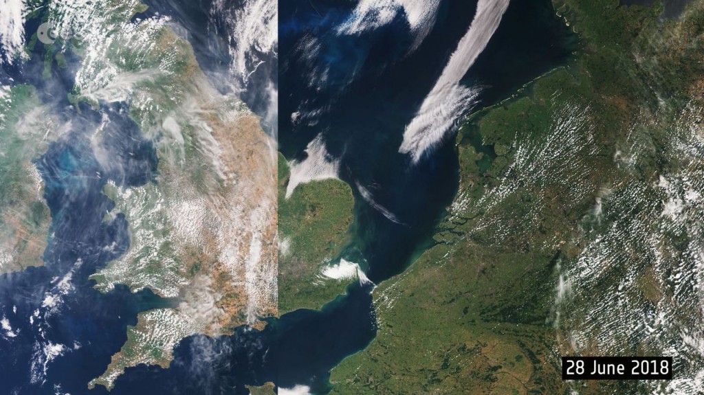 Satelitska snimka Sentinela-3 pokazuje područje Irske, Velike Britanije, Nizozemske, Belgije, Luxemburga, Njemačke i Francuske. Prvi dio snimke napravljen je 28. lipnja, a drugi dio 25. srpnja - razlika je i više nego vidljiva.