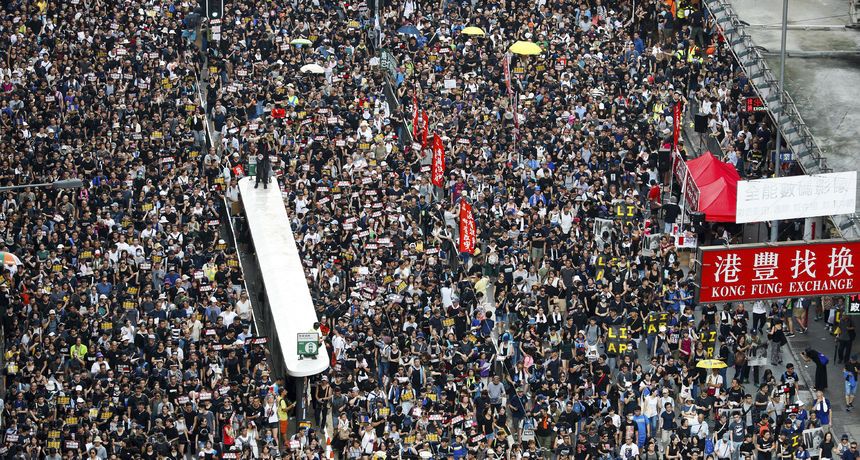 Prosvjednici svih dobi su u nedjelju sudjelovali u maršu kroz grad uzvikujući "Dolje pakleni zakon!" i "Preuzmimo Hong Kong, ovo je revolucija našeg vremena!".