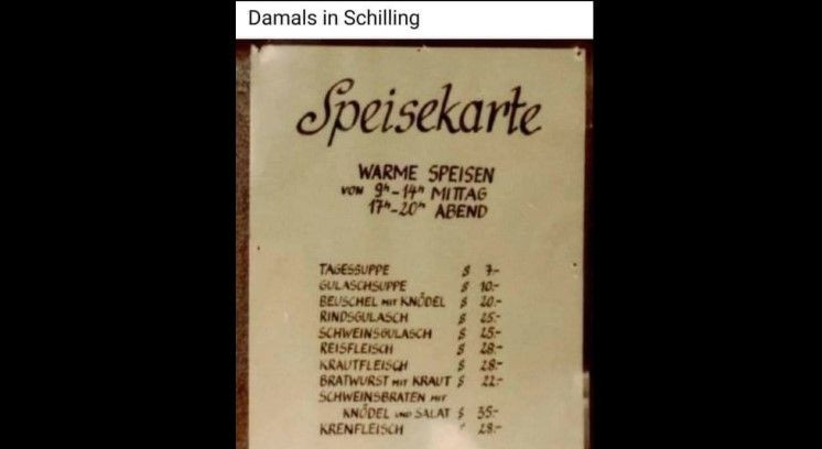 "8. veljače u 20 sati zapravo ćete moći platiti u šilinzima u Schwaigerwirtu. Jelovnik uključuje juhu dana za 7 šilinga (0,51 eura), goveđi gulaš za 25 šilinga (1,82 eura) ili svinjsko pečenje s knedlama i salatom za 35 šilinga (2,54 eura). Nevjerojatno niske cijene o kojima danas uglavnom možete samo sanjati!