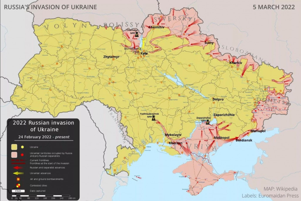 Glavni stožer ukrajinskih oružanih snaga priopćio je u ponedjeljak ujutro da se ruske snage pripremaju za napad na Kijev pokušajem preuzimanja pune kontrole nad gradovima Irpin i Buča, nedaleko od Kijeva te približavanjem glavnog gradu kroz istočna predgrađa.