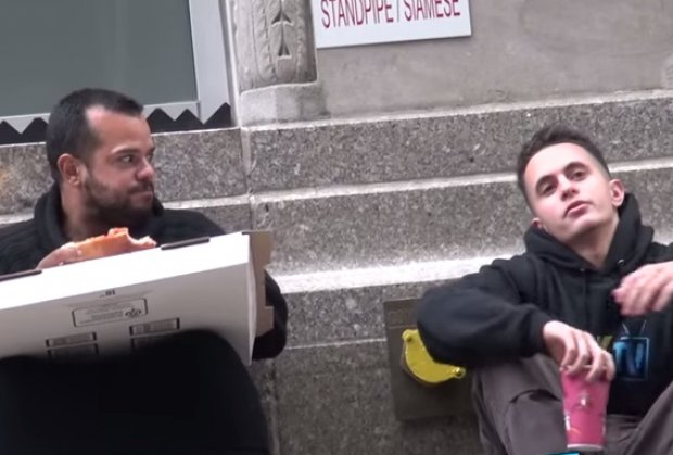 Onda su došli do beskućnika i dali mu ostatke svoje pizze koju nisu mogli da pojedu. Poslije 20 minuta došao je do njega mladić koji je mu je rekao da je mnogo gladan i tražio jedan komad pizze od njega.
