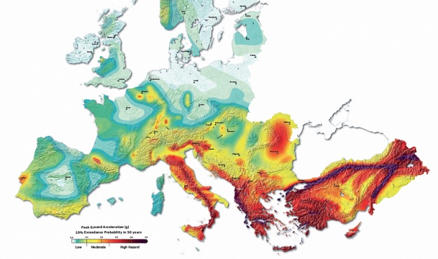 Europska karta seizmičke opasnosti prikazuje očekivano pomicanje tla u narednih 50 godina. Plava boja označuje područja relativno niske opasnosti, žuta i narančasta područja umjerenog rizika od razornih potresa i crvena područja visokog rizika.
