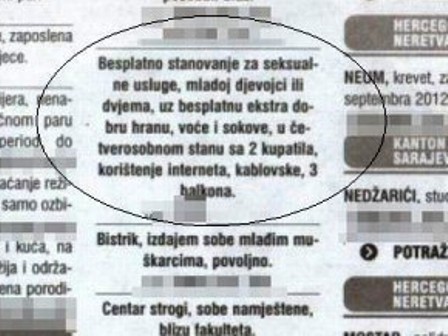Oglašivač nudi "besplatno stanovanje za seksualne usluge, mladoj djevojci ili dvjema, uz besplatnu ekstra dobru hranu, voće i sokove, u četverosobnom stanu sa dva kupatila, korištenje interneta, kablovske, tri balkona." Portal Radiosarajevo.ba je kontaktirao uredništvo Super oglasa iz kojeg su kazali kako je oglašivač platio oglas i da je i njima "bilo malo neugodno zbog oglasa".