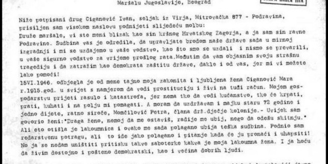 '15. lipnja 1946. odbjegla je od mene tajno moja zakonita i ljubljena žena Ciganović Mara r. 1915. god. u svijet s namjerom da vodi prostituciju i živi na tuđi račun. Mojem gospodarstvu prijeti rasulo i katastrofa, jer nema tko da vodi kućanstvo, tko će krpati, prati, kuhati i na polju pomagati. A moram da uzdržavam i majku staru 72 godine i jedno dijete, ratno siroče', piše Ivan Titu.