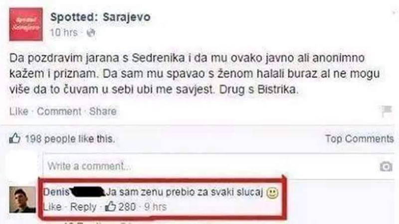 Sat vremena poslije izvjesni Denis mu je odgovorio: "Ja sam ženu prebio za svaki slučaj" , a što je izazvalo pravu pometnju među članovima ove Facebook stranice.