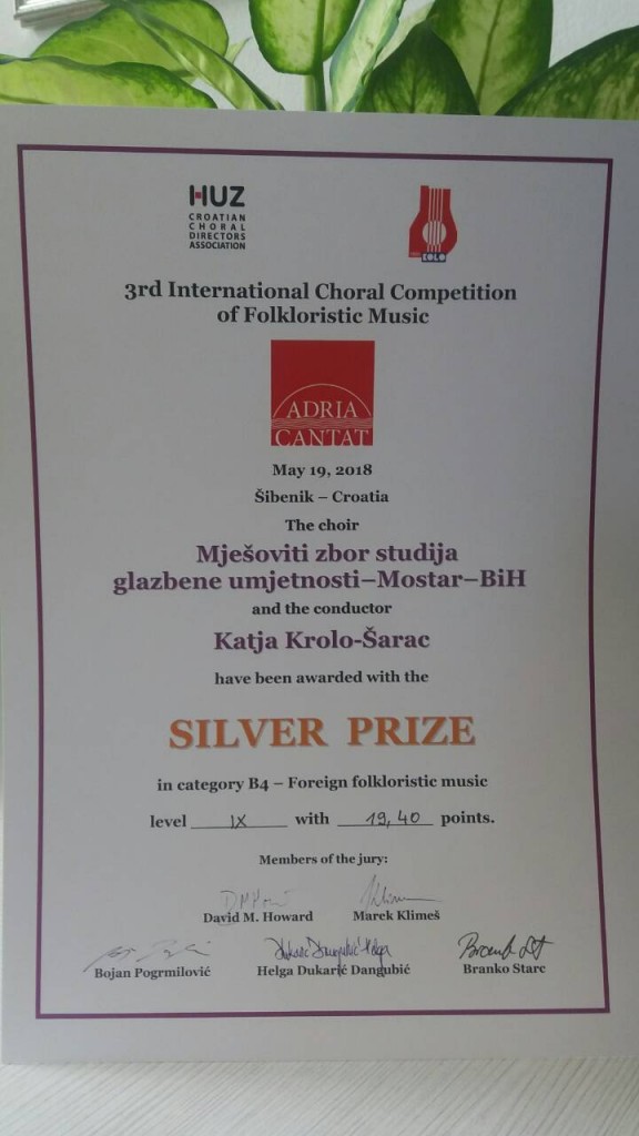 Mladi i vrijedni studenti pokazali su još jednom svoje umijeće u pjevačkom zajedništvu sa svojom voditeljicom, te su u samo desetak dana od zadnjega natjecanja pjevačkih zborova u Prijedoru osvojili još jedno srebro za uspješan nastup pred šibenskom publikom, na ponos Studija glazbene umjetnosti Fakulteta prirodoslovno-matematičkih i odgojnih znanosti Sveučilišta u Mostaru.