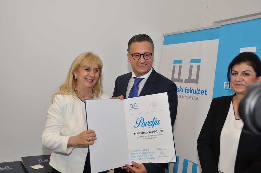 Plaketa za osobit doprinos ugledu i promociji fakulteta u javnosti dodijeljena je i akademiku Josipu Muselimoviću, počasnom predsjedniku Matice hrvatske Mostar.