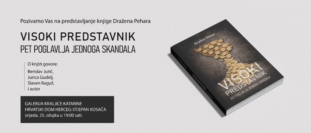 U srijedu, 25. ožujka s početkom u 19 sati, u Galeriji kraljice Katarine Hrvatskog doma Herceg Stjepan Kosača u Mostaru bit će predstavljena knjiga „Visoki predstavnik – pet poglavlja jednog skandala“ autora Dražena Pehara.
