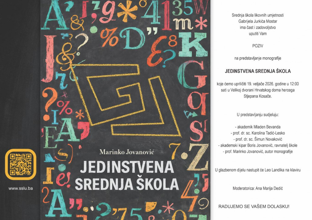 Srednja škola likovnih umjetnosti Gabrijela Jurkića Mostar organizira predstavljanje monografije „Jedinstvena srednja škola“, koje će se održati u srijedu, 19. veljače 2026. godine, s početkom u 12 sati u Velikoj dvorani Hrvatskog doma hercega Stjepana Kosače u Mostaru.