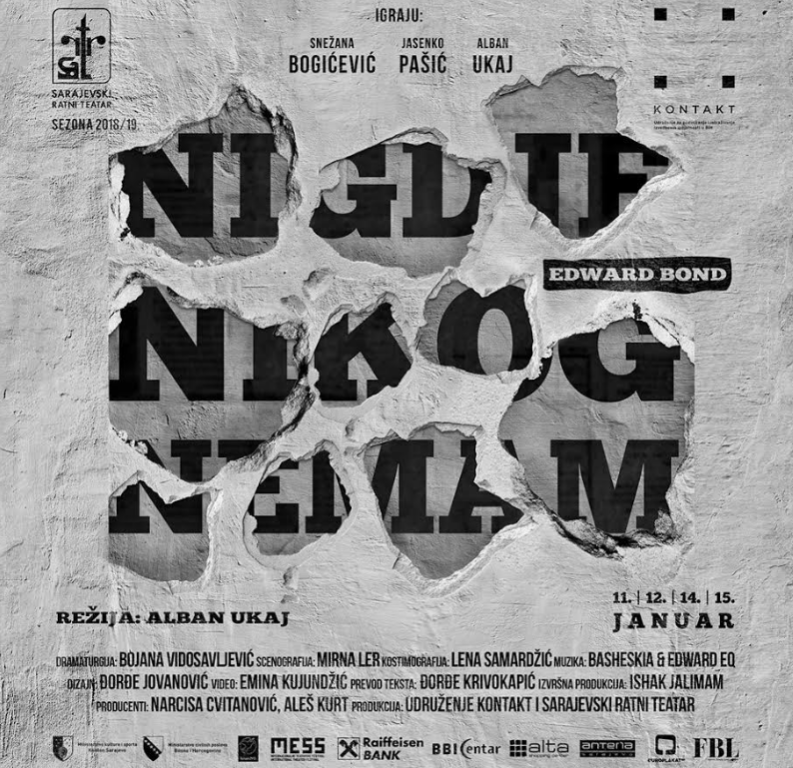 Predstava “Nigdje nikog nemam” po tekstu Edwarda Bonda, u režiji Albana Ukaja, bit će izvedena na Velikoj sceni NPM-a u srijedu, 11. 9. s početkom u 20 sati. Nakon odigrane predstave bit će održan razgovor s publikom i sudionicima.