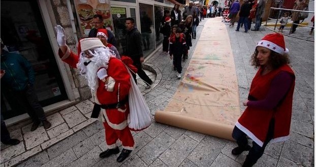 Čestitka je napravljena u radionici "Djeda Mraza" na Kačićevom trgu, gdje su je djeca svakodnevno crtala dolazeći u radionicu po razredima ili vrtićkim skupinama.