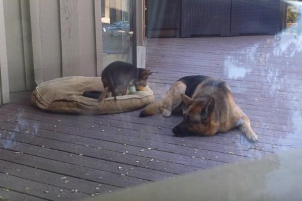 ... Njemačkog ovčara uporno pokušava da izbjegne spavanje igrajući se s gumenom igračkom. Nakon što ga je mama primijetila da je otišao iz svog krevetića vratila ga je nazad gurkajući ga i šapom ga postavila u ležeći položaj ne bi li napokon zaspao.