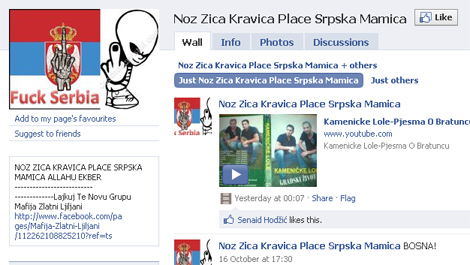 "Zaboravite šta su Srbi radili, ali upamtite šta smo im mi radili. To samo mi znamo. Neka nas sad pogledaju: imamo više od pola Bosne, i to glavne gradove, najveće. Ne smiju nam ništa, samo nam nešto govore preko fejsa i nekih medija. Neka se nađu sa nama na jednom mjestu i da se potuku sa muslimanima, vidjeli bi", prijetnja je koju je osnivač grupe "Nož, žica, Kravica - ubij ubij četnika" postavio na zid.