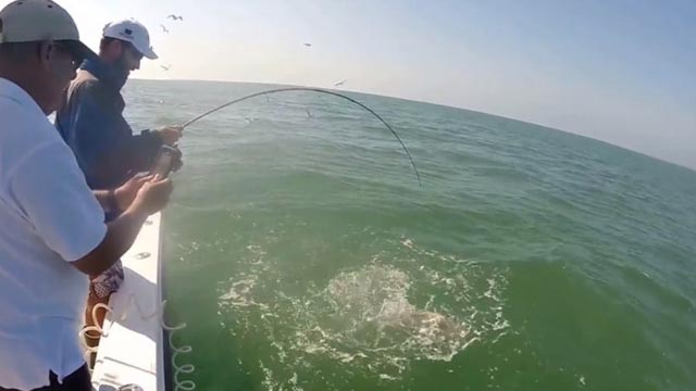 Grupa ribara imala je priliku snimiti rijetku situaciju kada se ove velike ribe hrane. Kapetan broda Jimmy Wheeler je objavio video na kojem je jedan od njegovih prijatelja upecao morskog psa dugog skoro metar. Kada ju je ribar počeo povlačiti, primijetio je veliku crnu sjenu koja se približavala.