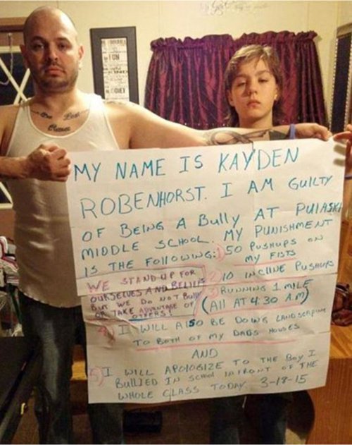'Moje ime je Kayden Robenshorts. Kriv sam jer sam bio nasilan u školi' rečenice su kojima započinje poruka, a među ostalim stoji da je Kayden obvezan raditi sklekove i trčati u pola 5 ujutro te se mora javno ispričati dječaku kojeg je gnjavio.