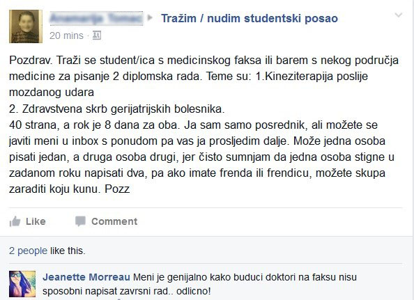 Ponuda za posao koji podrazumijeva pisanje dvaju diplomskih radova iz područja medicine izazvala je burne reakcije u komentarima, piše portal srednja.hr.