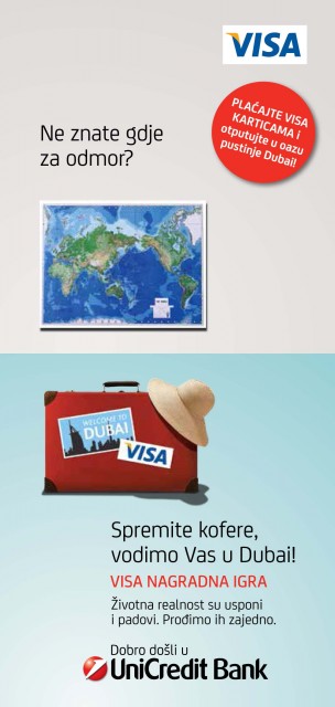 · UniCredit Bank je u suradnji sa Visa Int. pokrenula nagradnu igru pod nazivom ˝Plaćajte Visa karticama UniCredit Bank i osvojite nagradno putovanje u oazu pustinje Dubai˝