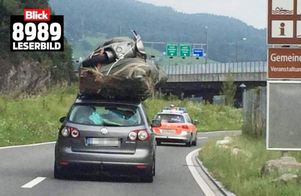No, čim je izašao s autoputa dobio je pratnju Kantonalne policije Luzerna koja je željela podrobnije ispitati kreativnu konstrukciju na krovu automobila.