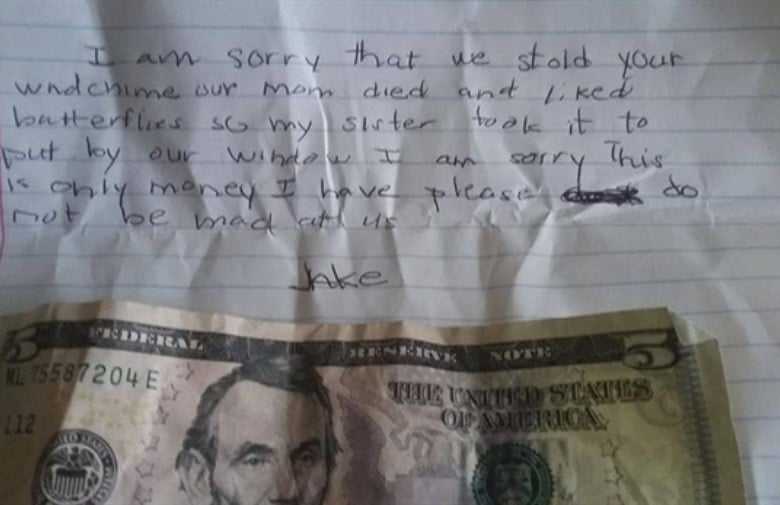 Poruka koju je napisao dječak imena Jake odnosila se na ukras s leptirima koji je Christina imala na ulazu u kuću, a koji je nestao. "Žao mi je što smo ukrali vaš ukras, ali mama nam je umrla, a jako je voljela leptire pa smo ga sestra i ja uzeli da ga objesimo na prozor. Jako nam je žao, ovo je jedini novac koji imam, molim vas nemojte se ljutiti. Jake", pisalo je u tužnoj poruci koju je Christina objavila na svom Facebook profilu.