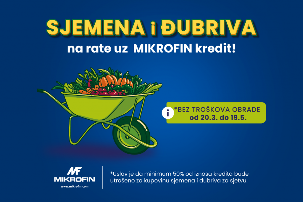 Izdvajajući se od konkurencije, društvo već godinama uspješno kreditira poljoprivrednike, nudeći lako dostupna rješenja kako velikim farmama, tako i malim gazdinstvima koja tek započinju svoje poslovanje. Kao pouzdan partner uspješnih poljoprivrednika, Mikrofin i ove godine predstavlja posebnu akciju koja podrazumijeva kredite za poljoprivredu od 5.000 do 50.000 KM bez troškova obrade, dostupne od 20.3. do 19.5.2023. Potvrđujući svoju ulogu pouzdanog oslonca, Mikrofin nudi klijentima iznimnu fleksibilnost u pogledu jamstava i mogućnosti dobivanja kredita bez jamaca. Uz to, svaki realizirani kredit prati prigodan poklon za sve klijente, kao znak zahvalnosti na ukazanom povjerenju.