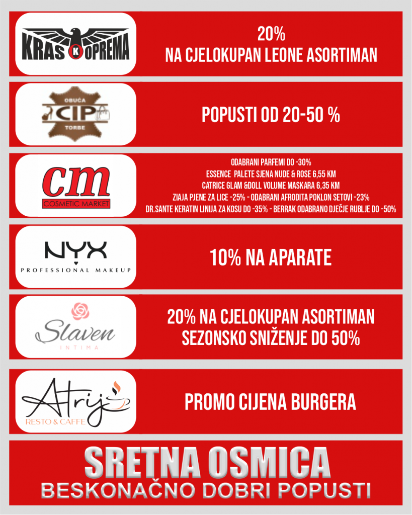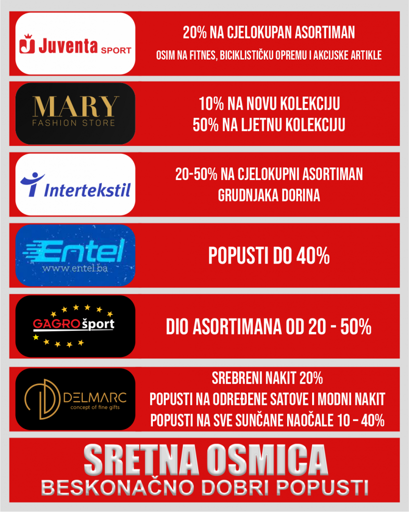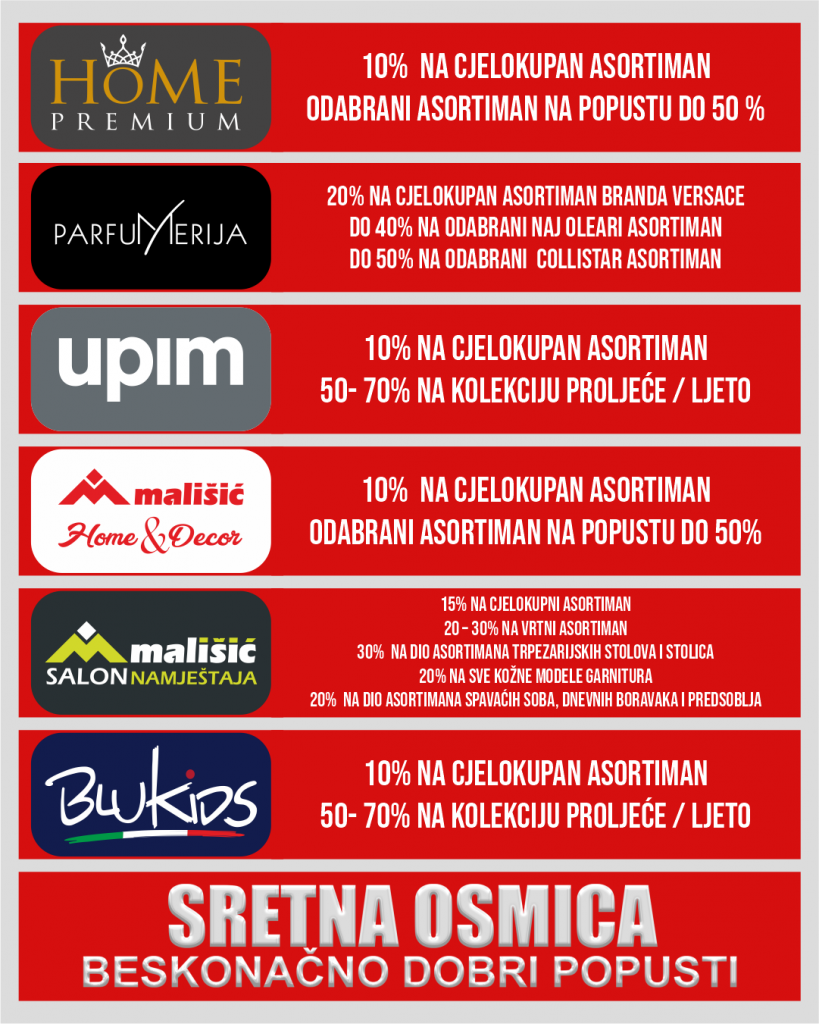 Prodajni centar Mališić Međugorje i ovog ponedjeljka, 8. rujna, donosi Sretnu Osmicu – dan odličnih akcijskih popusta i pogodnosti u brojnim trgovinama.