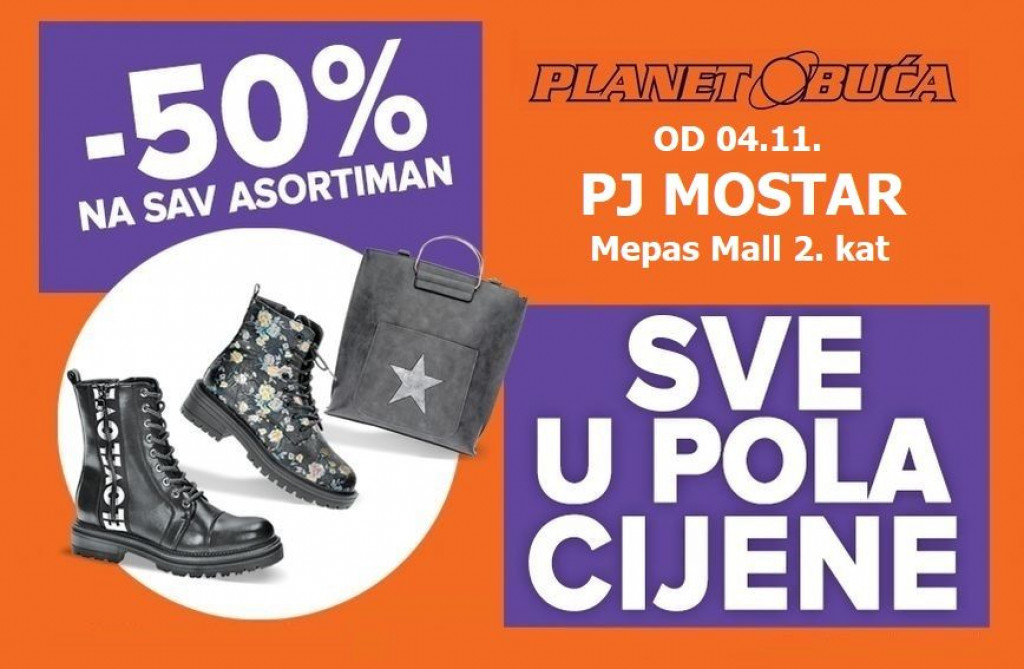 U najvećem maloprodajnom lancu obuće “Planet obuća” u Mostaru, na 2. katu Mepas Mall-a, u toku je najveća akcija do sada SVE U POLA CIJENE (FINALNA RASPRODAJA -50% – na SVE).