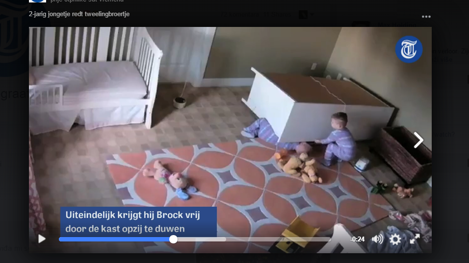 Naime, zahvaljujući sigurnosnoj kameri u dječijoj sobi zabilježen je ovaj trenutak bezazlene dječije igrice koja se zamalo pa pretvorila u tragediju. Ali bratska ljubav i ta neraskidiva veza blizanaca učinila je da ova bezazlena bratska igrica se ne pretvori u tragediju . Svega mu je 2.godine a uspio je cijeli ormar odgurati sa svog brata blizanca,koji  ga je prignječio i ugrozio njegov život .