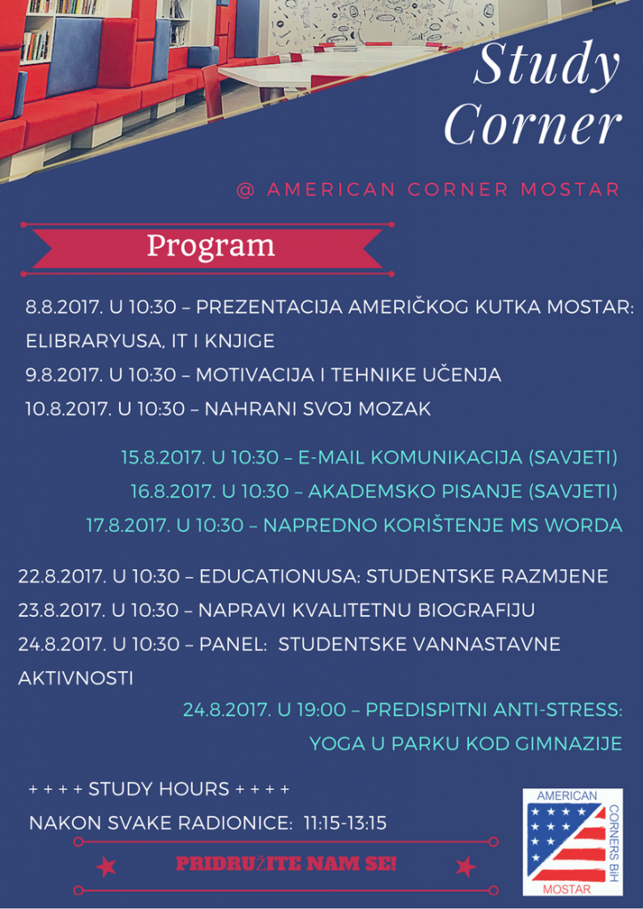 ...Study Corner", u sklopu kojeg je planirano 10 korisnih radionica i 9 dvosatnih termina za individualno ili grupno učenje - "tihi sati".