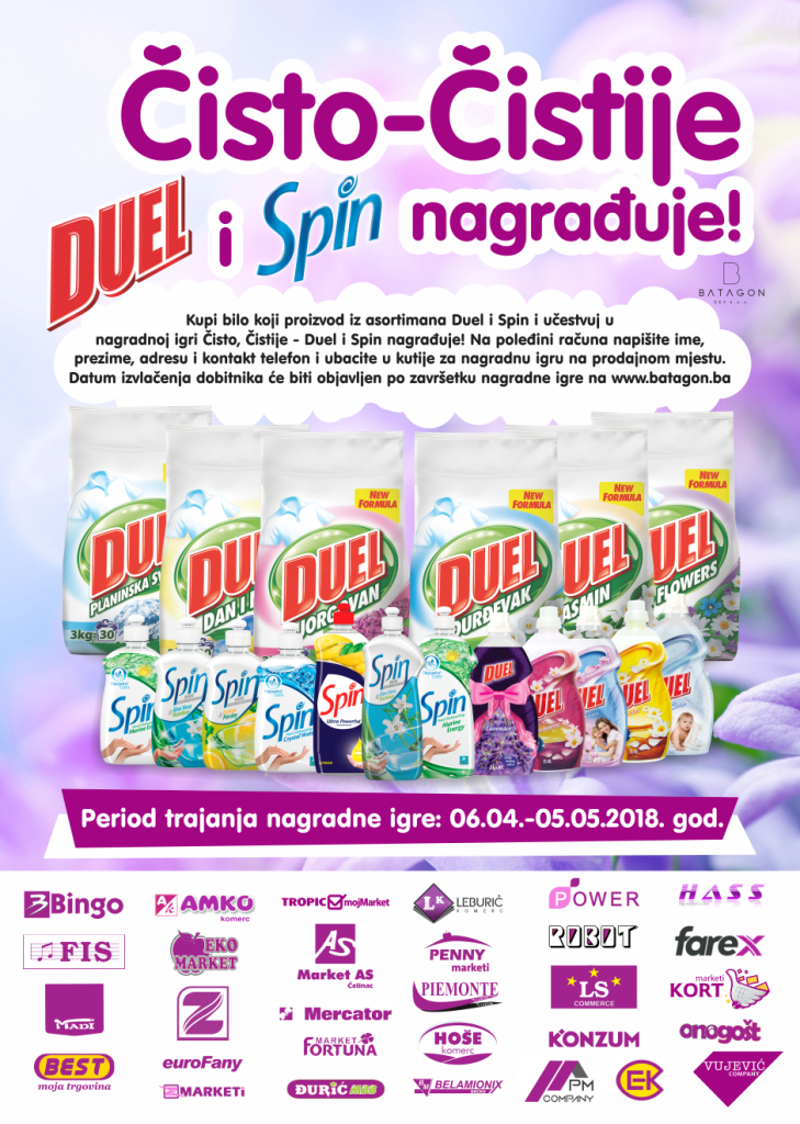 Nagradna igra traje u periodu 06.04.-05.05.2018., a učestvovati mogu oni koju vole čistoću i kupe jedan proizvod iz asortimana Duel-a i Spin-a. Znamo koliko je važno održavanje čistoće doma te da počinje vrijeme velikog sezonskog čišćenja. Zbog toga nastojimo da potrošači kupovinom ostvare i beneficije za svoje cjelokupno domaćinstvo.