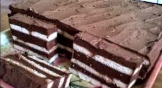 Kolač stavite u hladnjak preko noći (otprilike 8 sati) da keksi omekšaju i krema očvrsne.