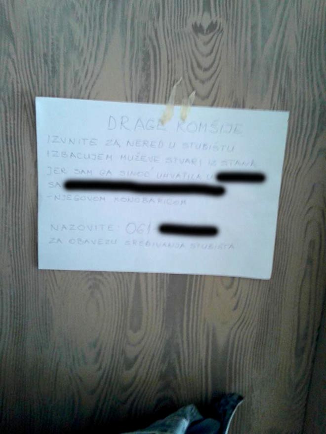 Bugojno: Žena jutros izbacila muža iz stana zbog preljube! Evo što je napisala na vratima