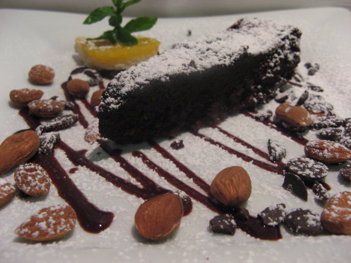 Čokoladu i maslac otopite na laganoj vatri. Nakon što se čokolada otopi dodajte šećer, na laganoj vatri miješajte 3-5 min, ostavite da se smjesa ohladi. U ohlađenu smjesu dodajte 4 jaja (koja ste pretkodno vilicom izmutili) i mljevene bademe. Dobro izmiješanu smjesu ulijte u kalup za torte i pecite na 150°C, 30 - 40 minuta.