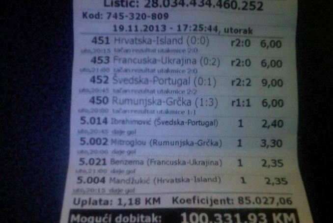 Ibrahimović i Benzema da će pogoditi, ali su ga dva para, tj. dva gola dijelila od velikog dobitka od oko 100.000 KM. Igrao je da će Francuska dobiti Ukrajinu sa 2:0, a bilo je 3:0, te da će Švedska i Portugal remizirati 2:2, a Ronaldo mu je ipak ugasio snove.