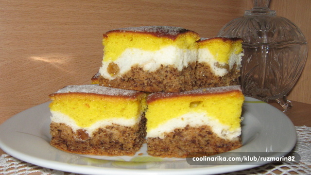 U drugoj posudi umutiti margarin sa preostalim šećerom, pa dodati žumanca, zatim brašno, prašak za pecivo i mljevene orahe. Na kraju u to umiješati snijeg od bijelanjaka.