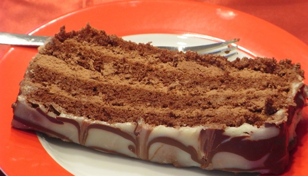 Čokoladno slatko vrhnje izvaditi iz hladnjaka, dodati dva učvršćivača za šlag i kremasto izraditi. Kremu podijeliti na tri dijela. Jedan biskvit preliti s četiri žlice čokoladnog mlijeka i premazati 1/3 kreme. Postupak ponavljati i s ostatkom kreme i biskvita. Ostaviti u hladnjaku da se stegne. Bijelu narezanu čokoladu zajedno s maslacem i slatkim vrhnjem na laganoj temperaturi omekšati. Kolač premazati bijelom glazurom. 50 g čokolade za kuhanje i 1 žlicu ulja na laganoj temperaturi omekšati i kolač ukrasiti.