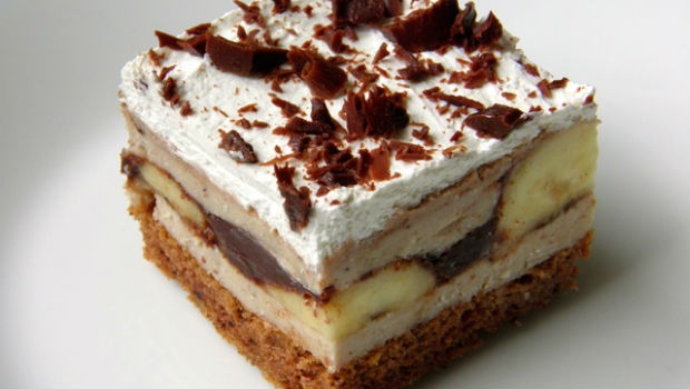 Na ohlađeni biskvit koji prethodno zalijete sa 1,5 dl mlijeka s rumom, premažite polovicu kreme, složite po njoj banane prerezane po dužini, pa zatim prostor između banana popunite otopljenom čokoladom. Stavite kolač na 20 minuta u hladnjak kako bi se čokolada stvrdnula. Tada premažite ostatkom kreme od kestena i na kraju sve premažite tučenim vrhnjem za šlag. Po želji ukrasite čokoladnim strugotinama.