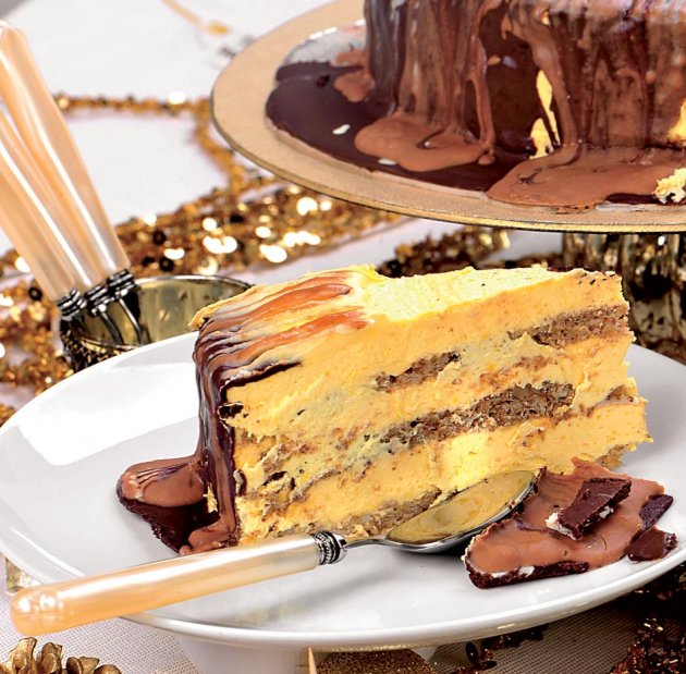 Ohladjeni fil izmijesati sa umućenim maslacem i filovati kore, prvo sa orasima, u sredini sa bademima, a preko staviti koru sa lješnicima.Premazati tanko filom sa svih strana, pa kad se malo rashladi preliti čokoladnom glazurom.Za dekoraciju umutiti pjenasto maslac i rastopljenu čokoladu (1:1), i špricem sa zvjezdastim nastavkom napraviti borduru. Stranice ukrasiti mljevenim lješnicima.