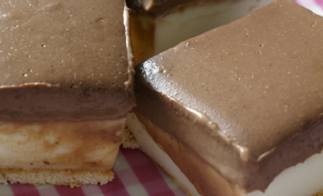 3. Za drugu kremu na laganoj vatri ugrijte vrhnje u koje ste umiješali nasjeckanu čokoladu, kad se čokolada otopi prelijte preko prve kreme, stavite da se ohladi i gotovo!
