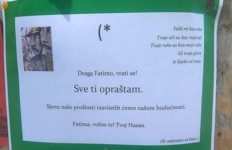 Na dnu oglasa napisano je kako Hasan ljubav ili Fatimu u protivnom mijenja za fiata. Naravno, oglas je ekspresno završio na društvenim mrežama i za kratko vrijeme izazvao brojne komentare.