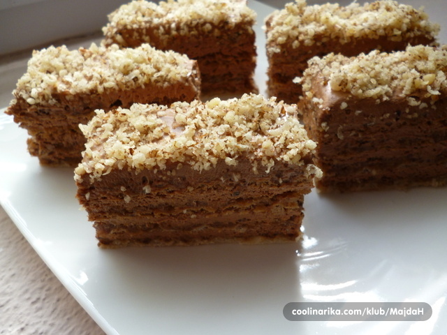 Slaganje: oblatne prerezati po pola (ne po dužini, nego po širini). Dobiti ćete četiri dijela. I fil podijelite na četiri dijela. Mazati oblatne i slagati jednu na drugu, ali zadnju oblatnu ne mazati odmah filom već preko nje staviti papir za pečenje i neki protvan na koji ćete staviti nekoliko knjiga da se Kilerica izravna. Kada se sve lijepo poravna nanijeti fil i na zadnju oblatnu i posuti mljevenim orasima.