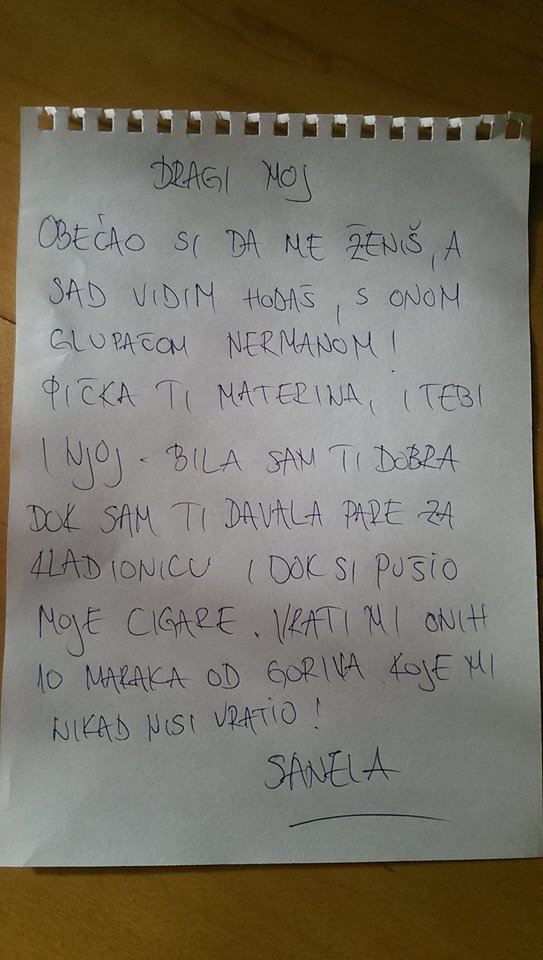 "Obećao si da me ženiš, a sad vidim hodaš, s onom glupačom Nermanom! Bila sam ti dobra dok sam ti davala pare za kladionicu i dok si pušio moje cigare", piše Sanela.