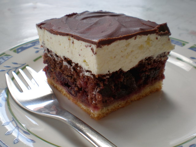 Izvaditi kolač iz pećnice, poslagati od gore višnje, zaliti ostatkom smeđe biskvitne mase i ispeći do kraja (još oko 30 min).
