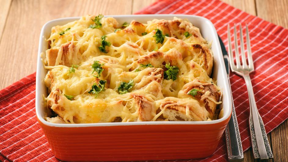 Zagrijte pećnicu na 200°C. Na dno posude za pečenje stavite malo bešamela i posložite ocijeđenu cvjetaču, pospite je sjeckanom slaninom, zatim posložite ploške kruha i prelijte opet umakom. Pospite parmezanom i majčinom dušicom te pecite oko 15 minuta.