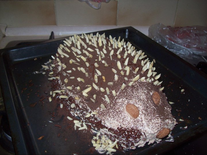 Cijelog ježa omazati kremom, posuti mljevenim bademima, ukrasiti bodljama, a oči i nosić napraviti od čokolade. Dobro ohladiti i poslužiti.
