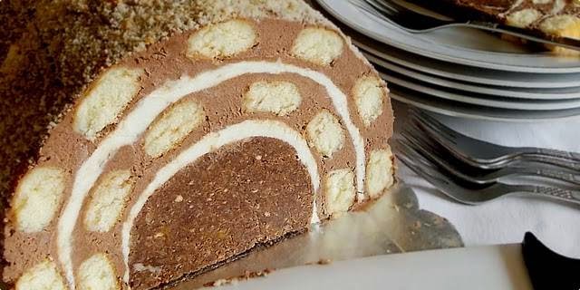 Premazati ostatkom bijele kreme, opet tanak sloj tamne kreme pa piškote (7 piškota po širini) popuniti prazninu između piškota i premazati ostatkom kreme. Ukrasiti po želji.