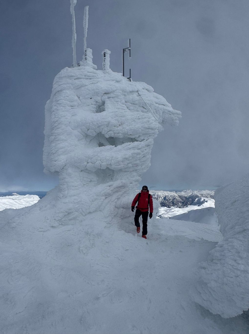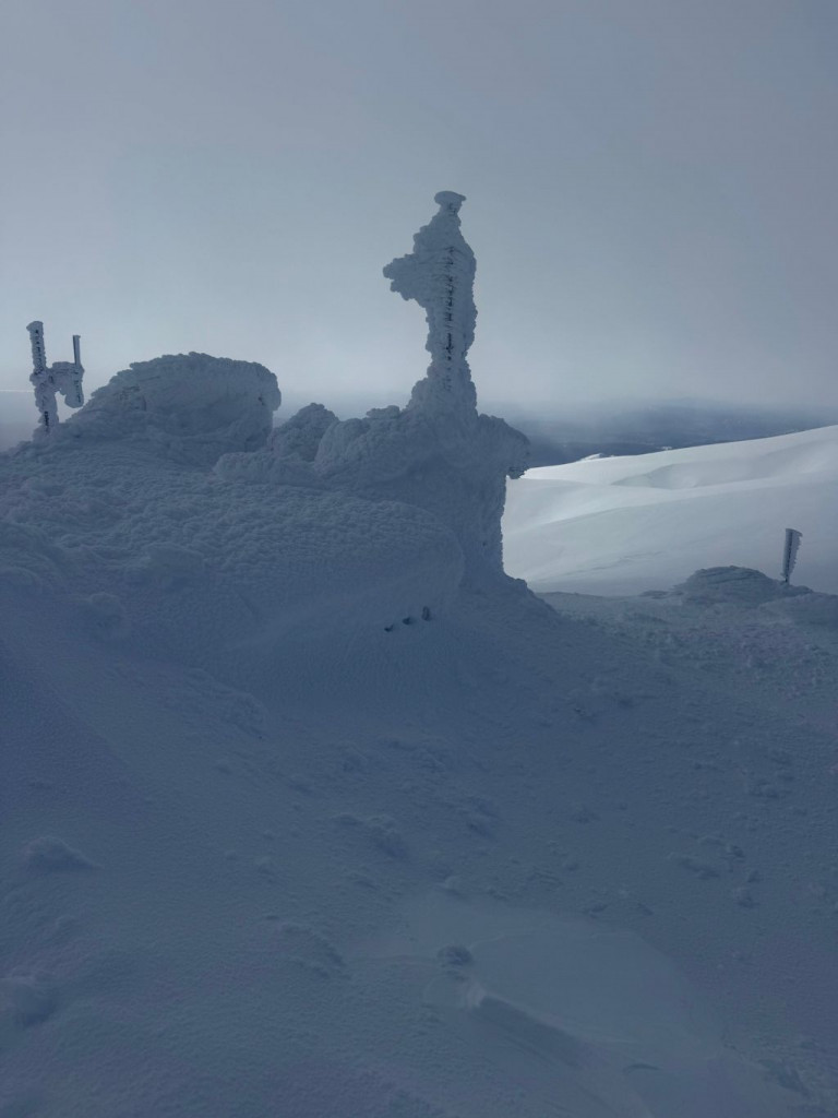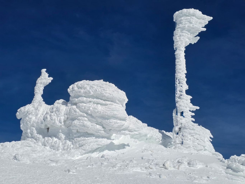 Snažan vjetar i dugotrajne temperature ispod ništice oblikovali su objekte u masivne ledene formacije. Antene, stupovi i konstrukcije prekriveni su debelim slojevima leda.