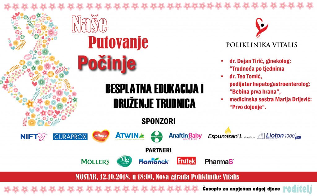 Prvo druženje održat će se u Mostaru 12. oktobra 2018. godine, u saradnji sa Poliklinikom Vitalis. Nova zgrada ove poliklinike bit će mjesto savjeta, druženja, komunikacije, te dodjeljivanja nagrada i poklona. Program počinje u 18:00, te će pored edukativnih predavanja, trudnice imati priliku dobiti i poklon vrećice sa promotivnim materijalom, časopis Roditelj, te promotivni materijal klinike. Pored toga, tu su nagrade i poklon paketi sponzora i partnera. Za svaku prisutnu trudnicu Poliklinika Vitalis osigurala je poklon kupon sa 50% popusta na pregled.